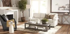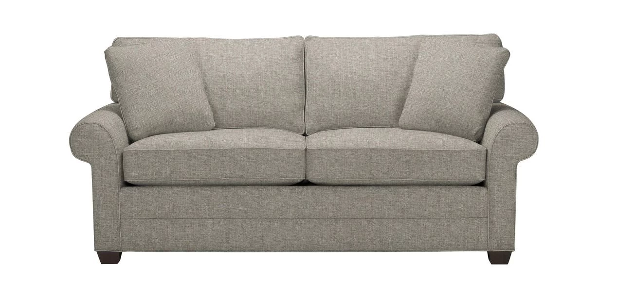 - With plush rolled arms and loose back and seat cushions, this sofa has a look that’s both comfortable and casual. Comes with 2 17″ pillows.