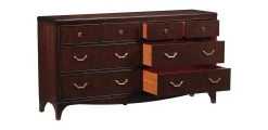 - Classic double dresser where timeless veneer patterns meet updated Satin Gold hardware