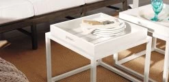 - Patio tray table crafted from powder-coated aluminum. Removable tray. Indoor/outdoor use.