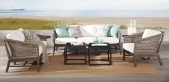- Round patio end table crafted from powder-coated aluminum. Indoor/outdoor use.