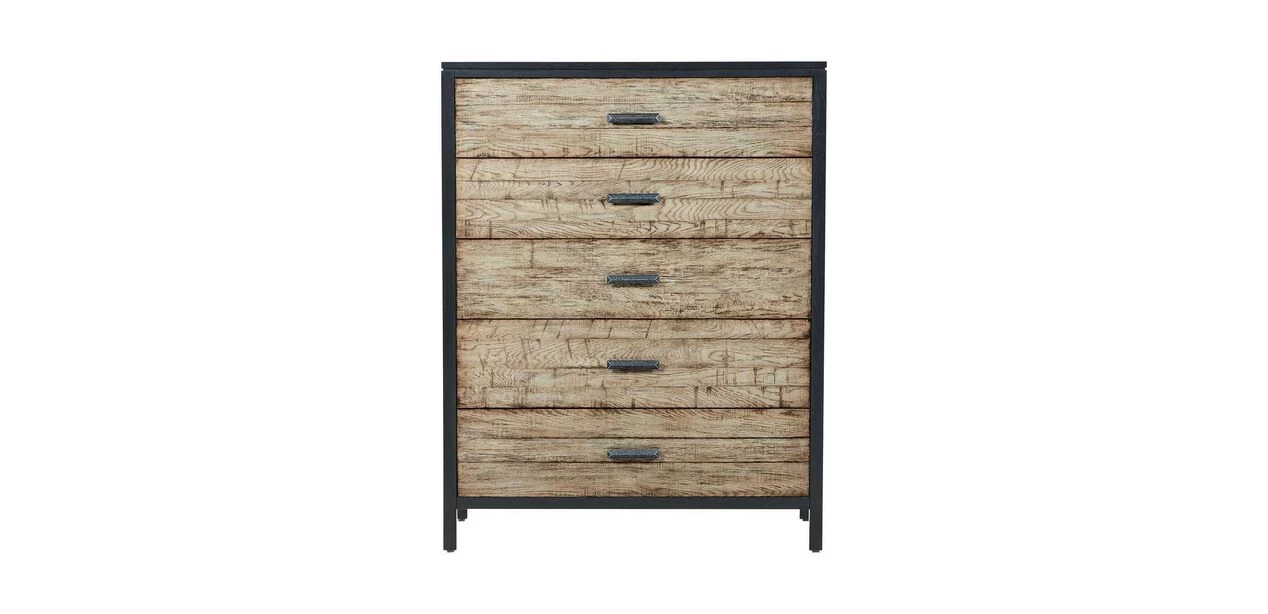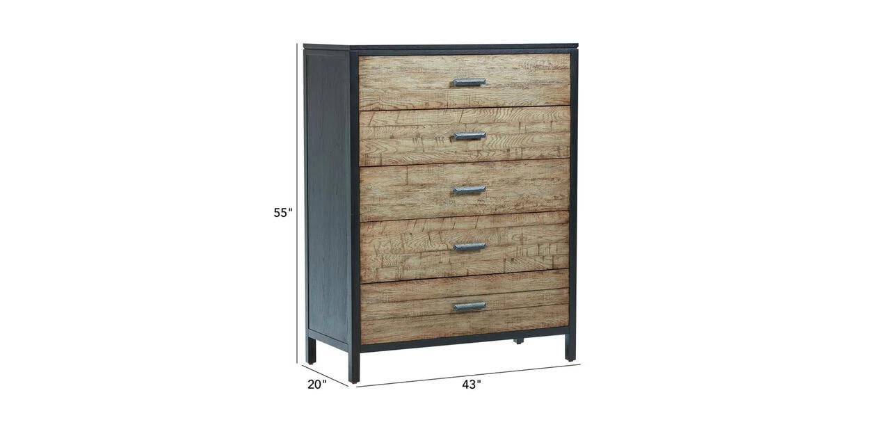 The Merrick tall chest fits modern urban décor as well as it complements country and coastal design. Minimalist industrial hardware contrasts beautifully with rough-sawn drawer fronts.