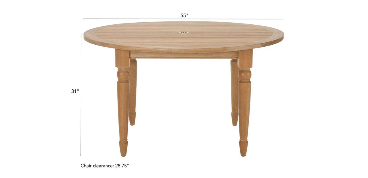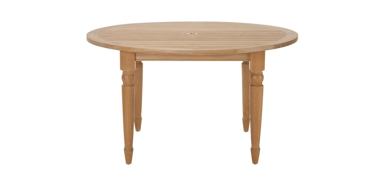 One part English garden. One part West Indies lanai. Our Millbrook collection is built to last and looks great doing it. The round dining table has a fixed slatted top with a brass-fitted umbrella hole/grommet and comfortably seats four.