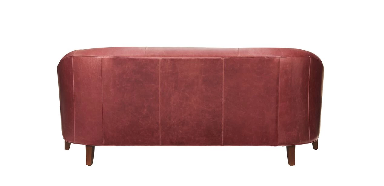 - Glamorous leather barrel-back sofa with a tight back and loose seat cushions