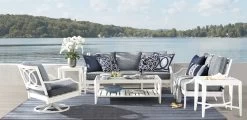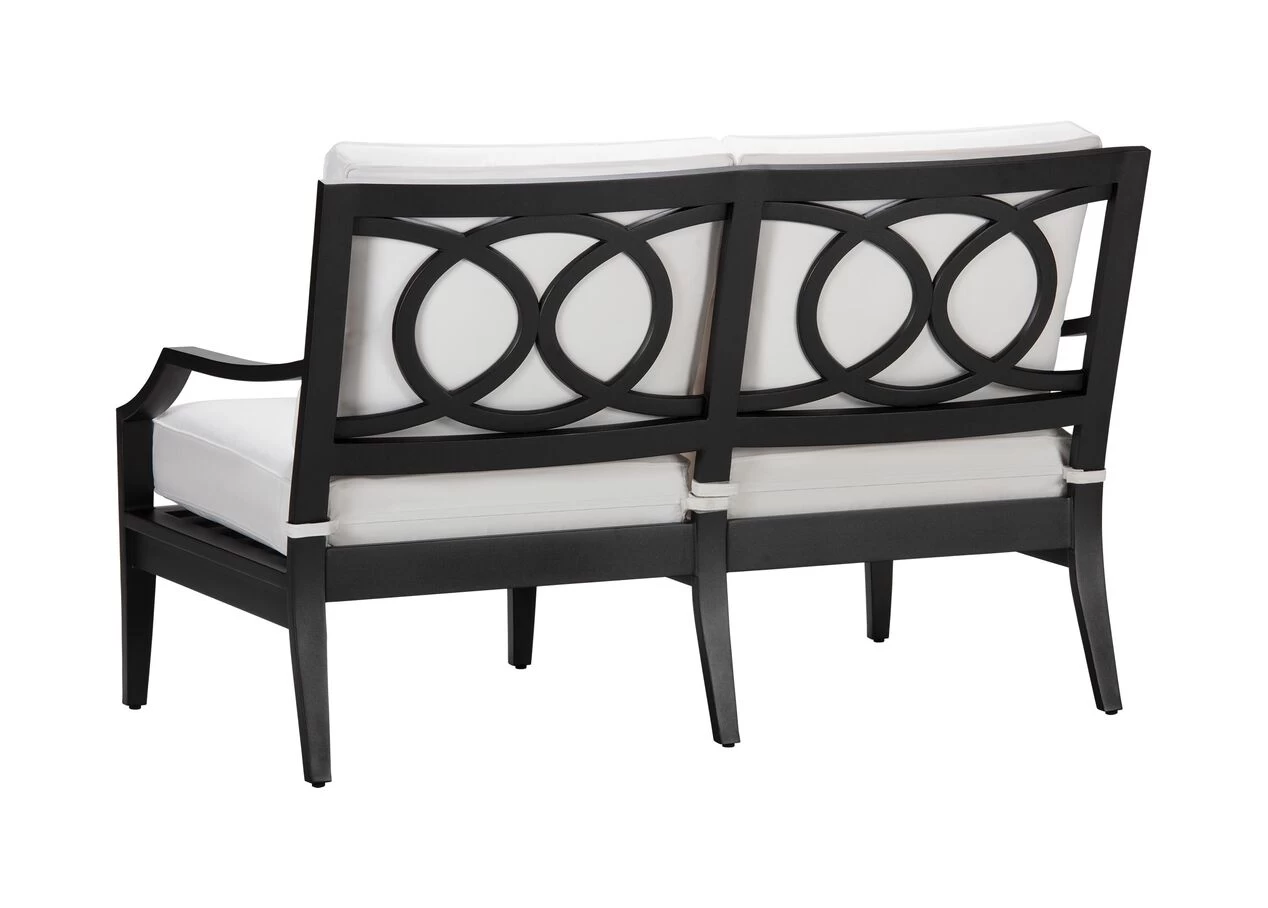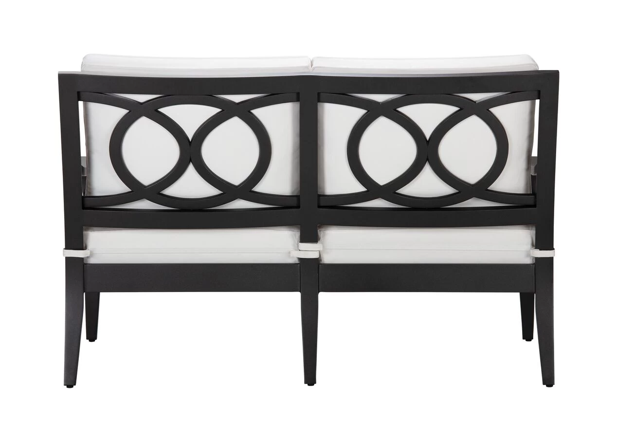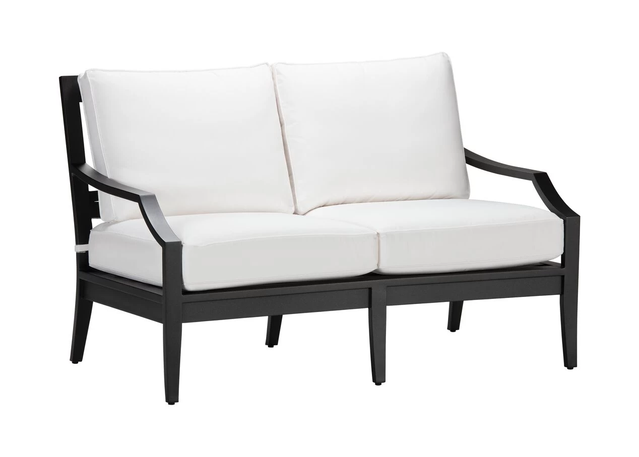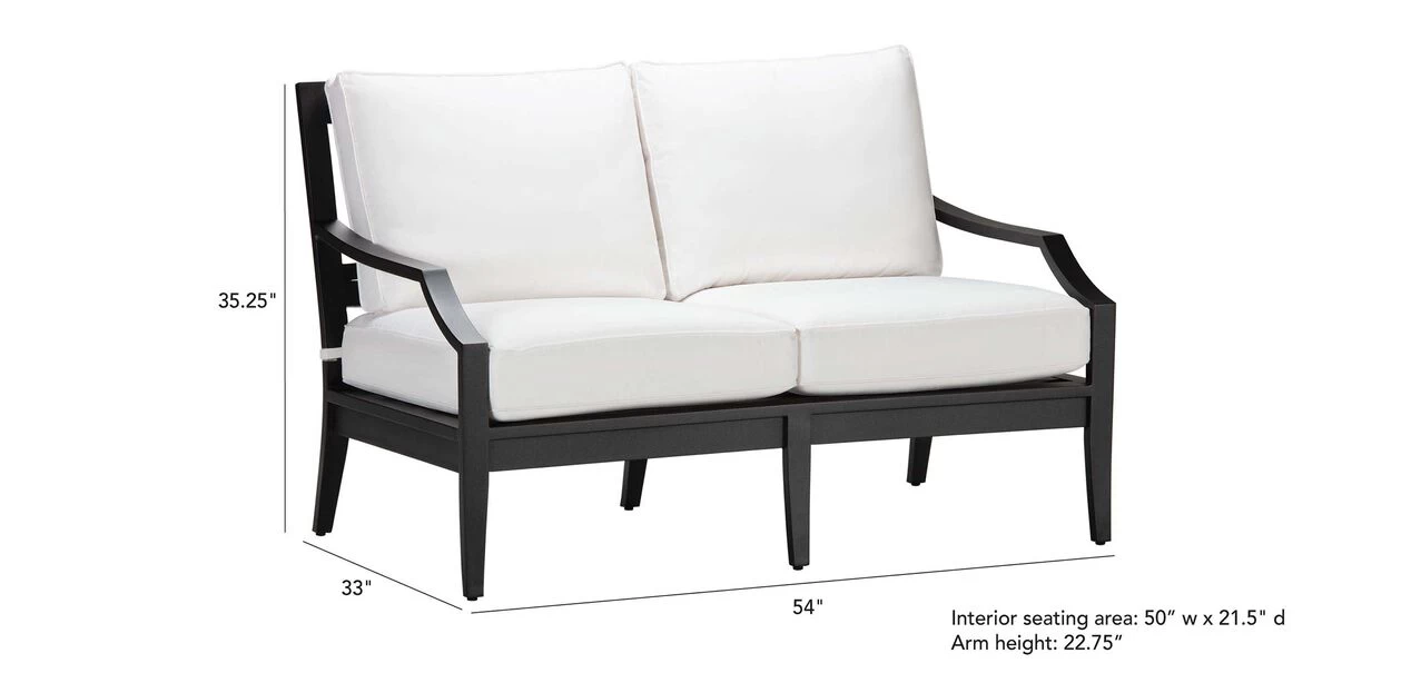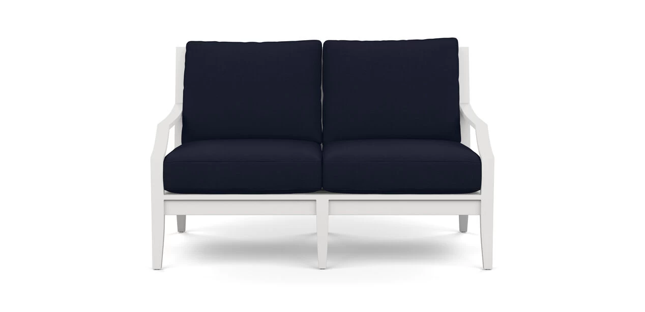 - A cozy, cushioned outdoor aluminum-frame loveseat, with an easy-care aluminum frame. Indoor/outdoor use.