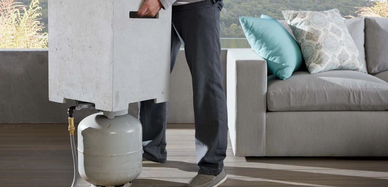 - Made from ultra-light, resin-free, 100% concrete for ease of use and durability; to access propane tank, simply lift off the enclosure and place to the side