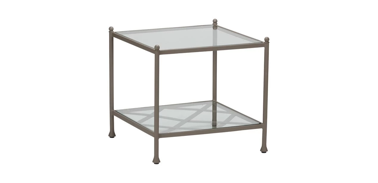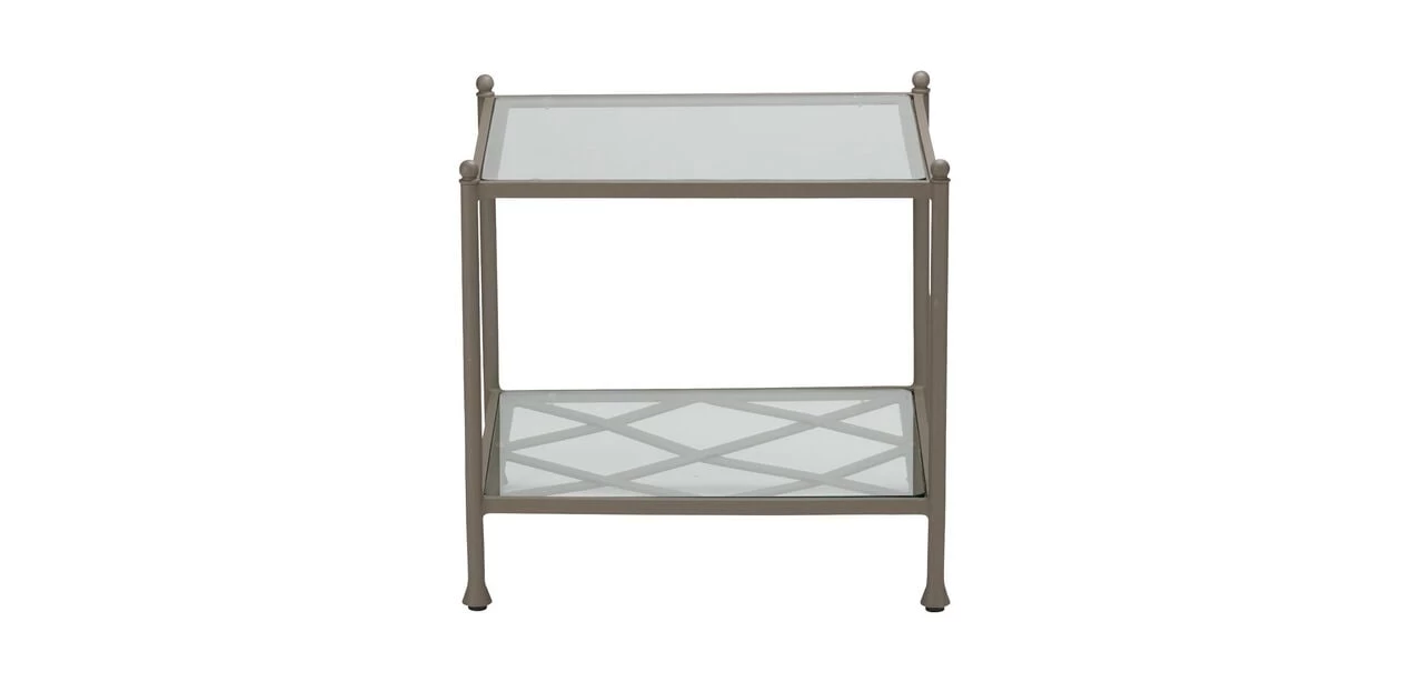 Stash your favorite novel, your iced tea, and/or your fruity frozen drink chairside. Durable powder-coated aluminum frame, with tempered glass top. Shelf made from woven aluminum cross-hatch strips beneath tempered glass.