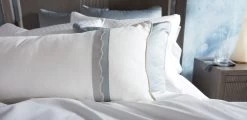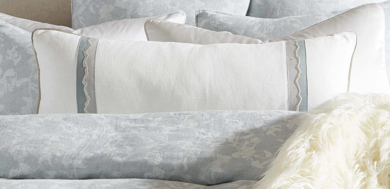 Crisp bands of decorative trim tape define the style of our White Banded Bolster Pillow, but what truly makes this pillow a statement is the demure silver metallic accent that meanders through them. Complements our Salena Embroidered Euro Sham and Salena Embroidered Bolster Pillow.